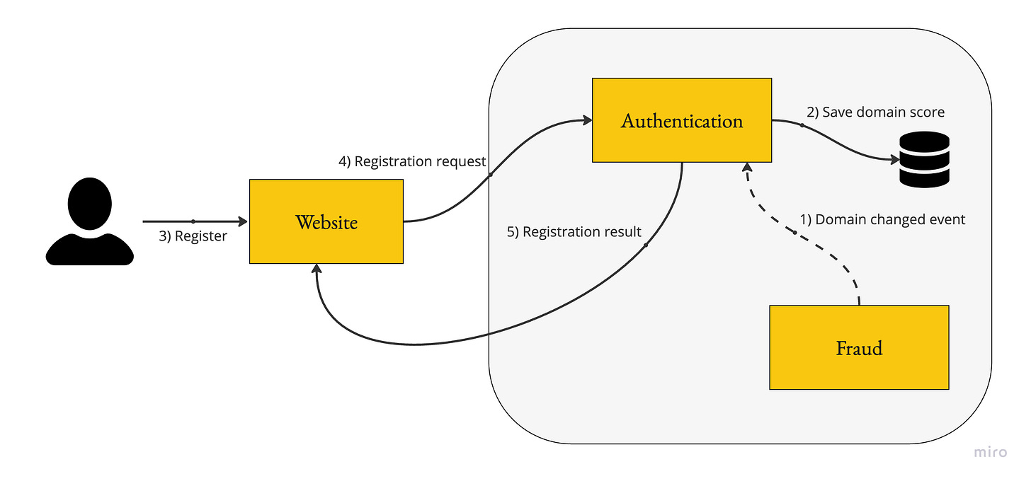 The Authentication service saves a local copy of each domain’s fraud score based on events. The registration flow relies on this data, avoiding the online network call to the Fraud service. Here are the main pros and cons: