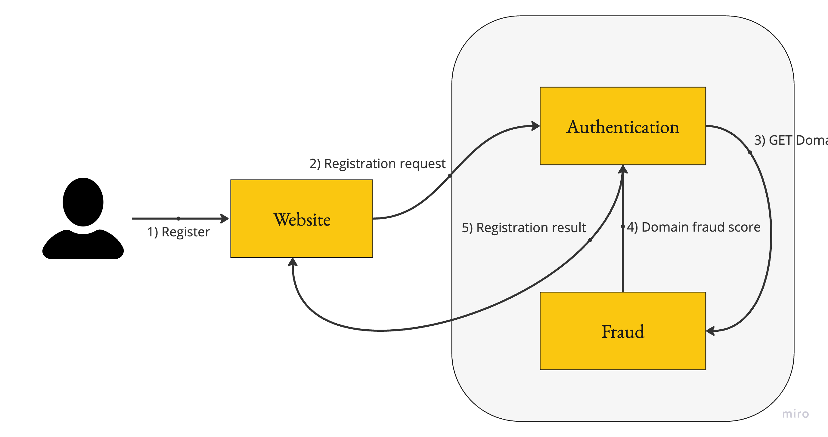 In this approach, each registration attempt involves calling the Fraud service to get the domain fraud score. Here are the main pros and cons: