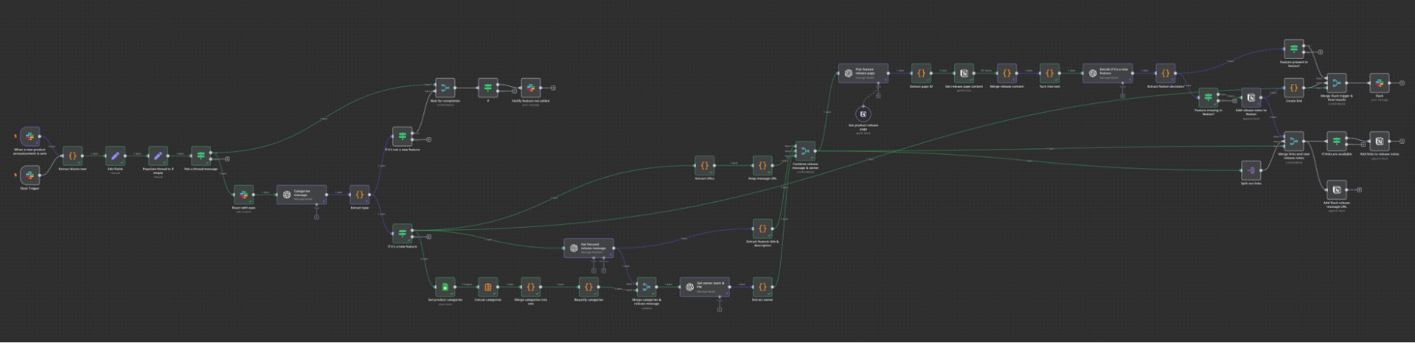 The business workflow is such that every new feature release is announced internally on our Slack. Instead of gathering everything at the end of the month, the agent picks it up in real-time and notifies in the thread once it’s finished.