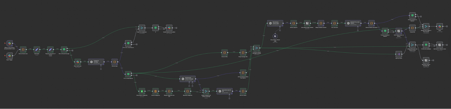 My team and I used to create monthly changelogs for product releases. The manual process took about a week, with over a day just to gather the necessary information. I built an AI agent in n8n that streamlined this process to be real-time, reducing the time it takes to just a couple of hours.