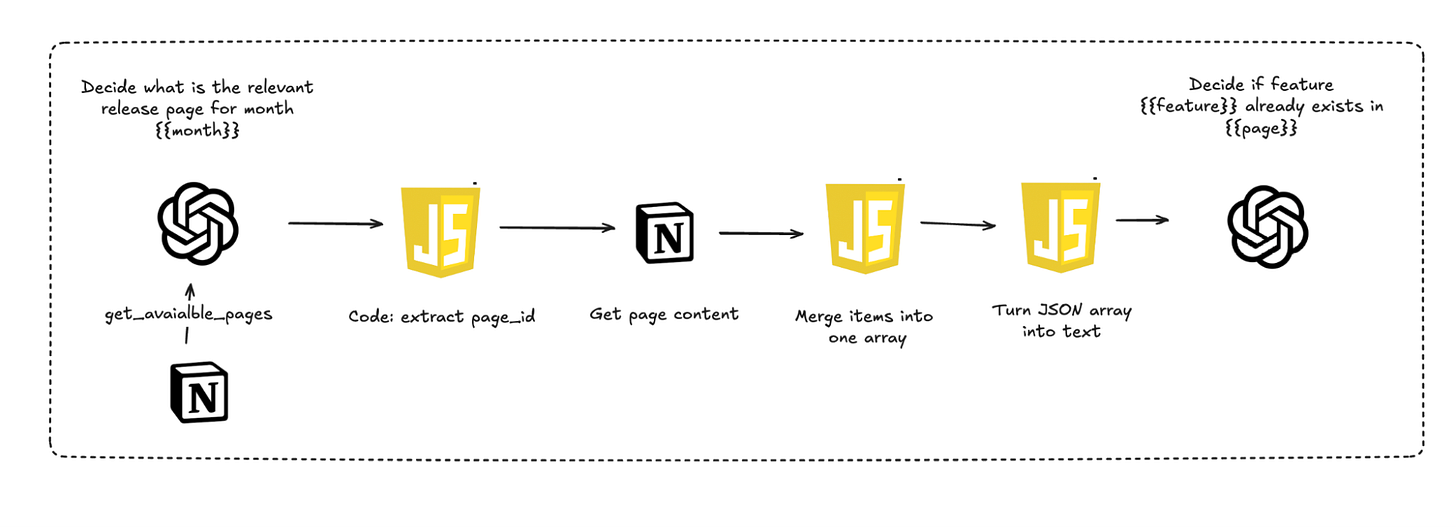 Release page - While it may sound easy, figuring out the right release page in Notion for the month is not a trivial task (I will elaborate on that below). This agent should output the page ID for the rest of the process.