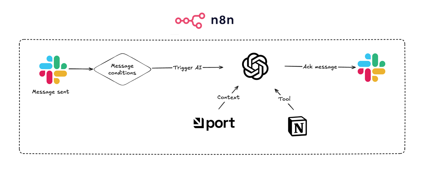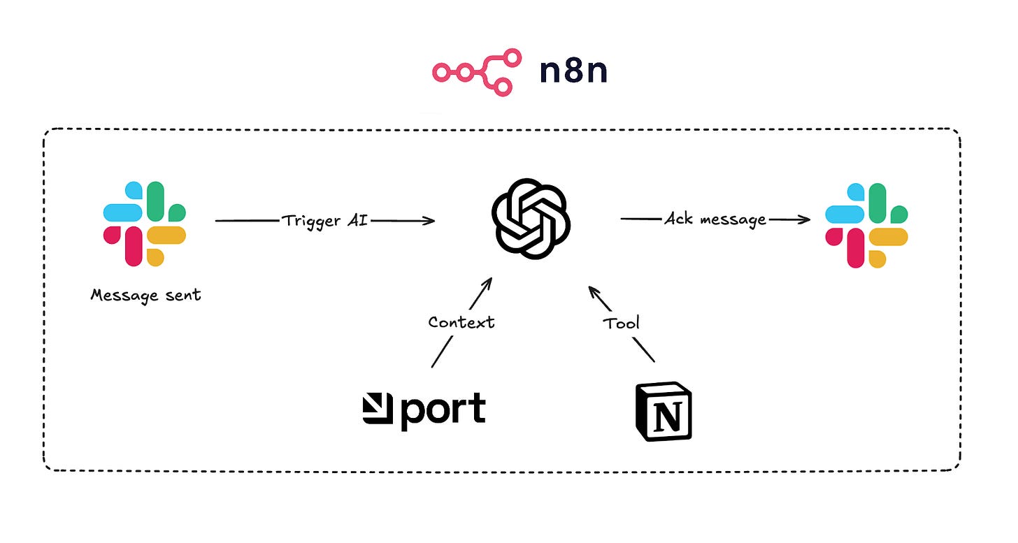 The workflow starts with a Slack trigger, then moves to a simple agent with access to broader context in Port (our internal developer portal, which is the product we’re building) and Notion, the tool where the release changelog is written.